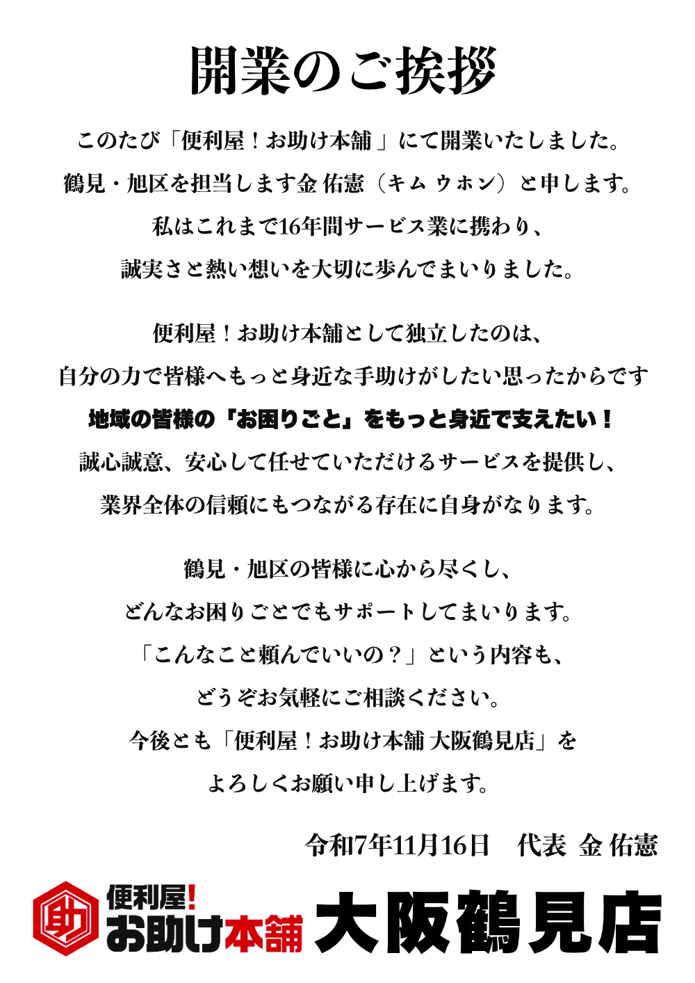 ぜひ、「便利屋!お助け本舗 鶴見店」金佑憲をよろしくお願いいたします。